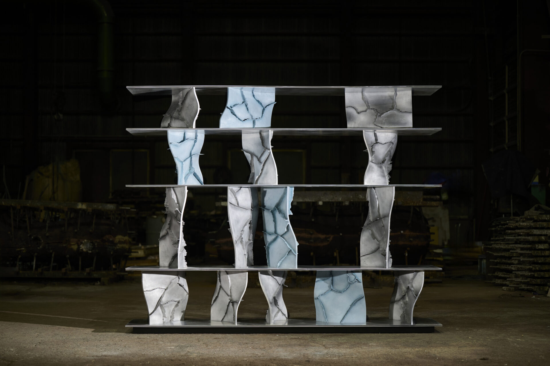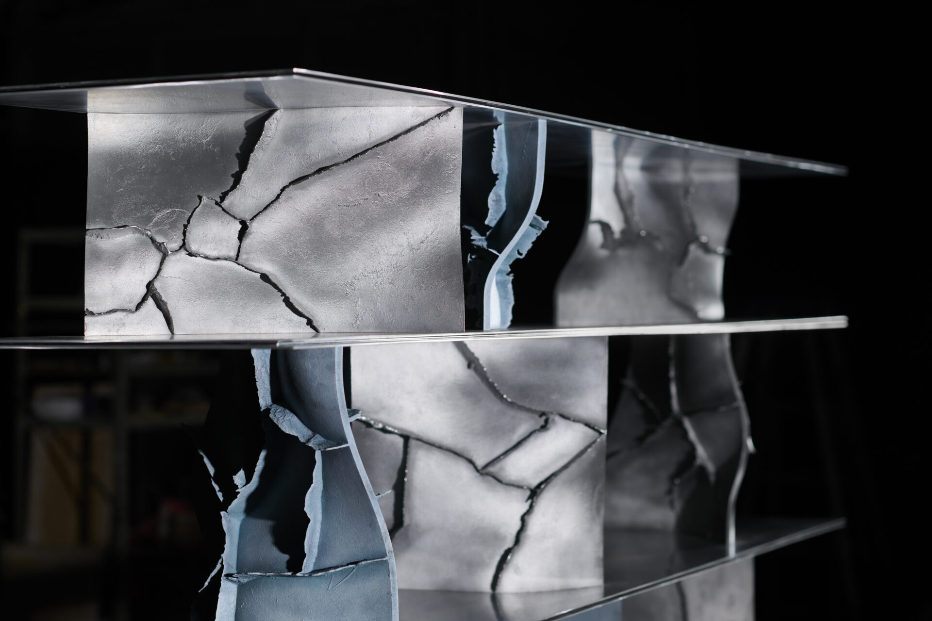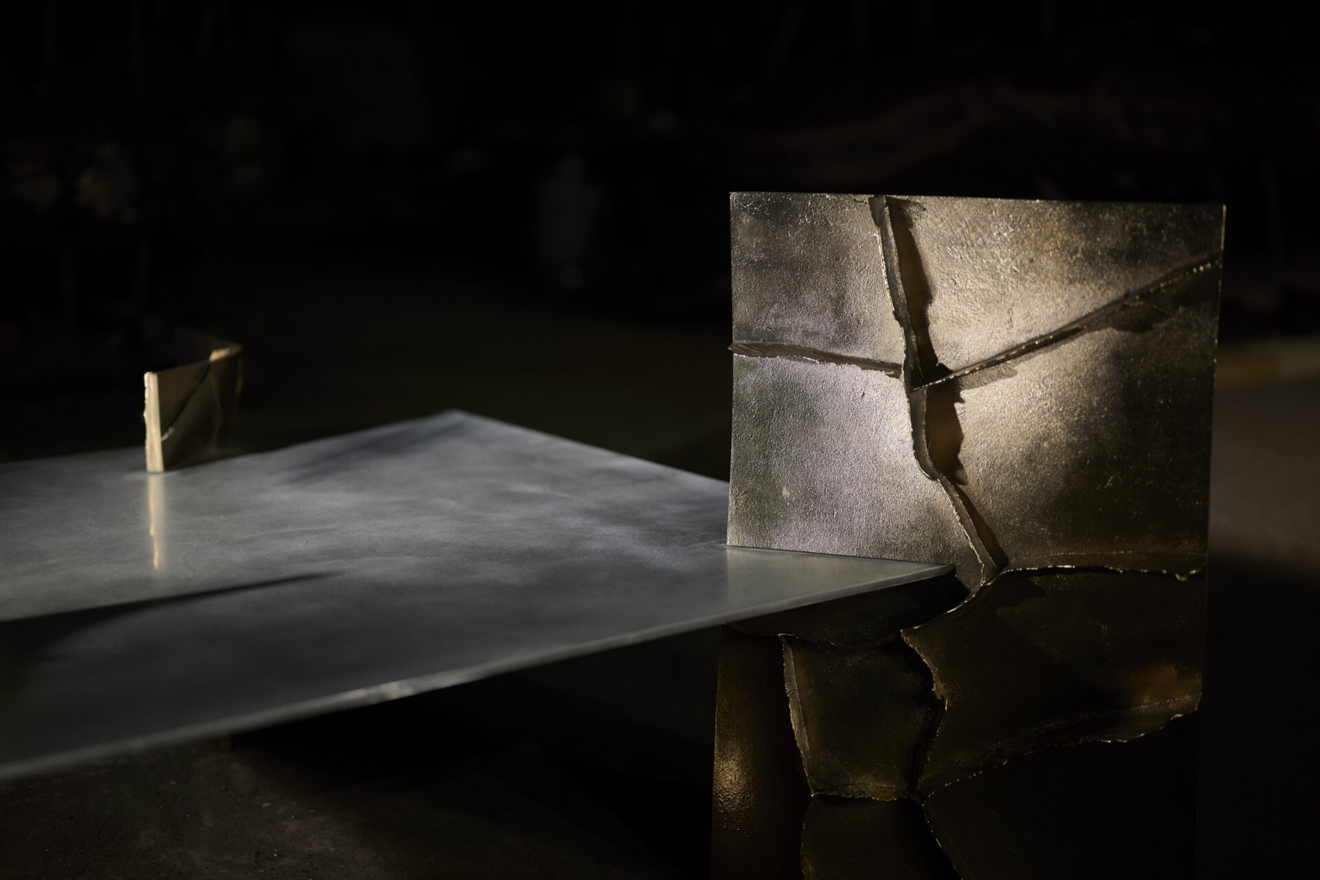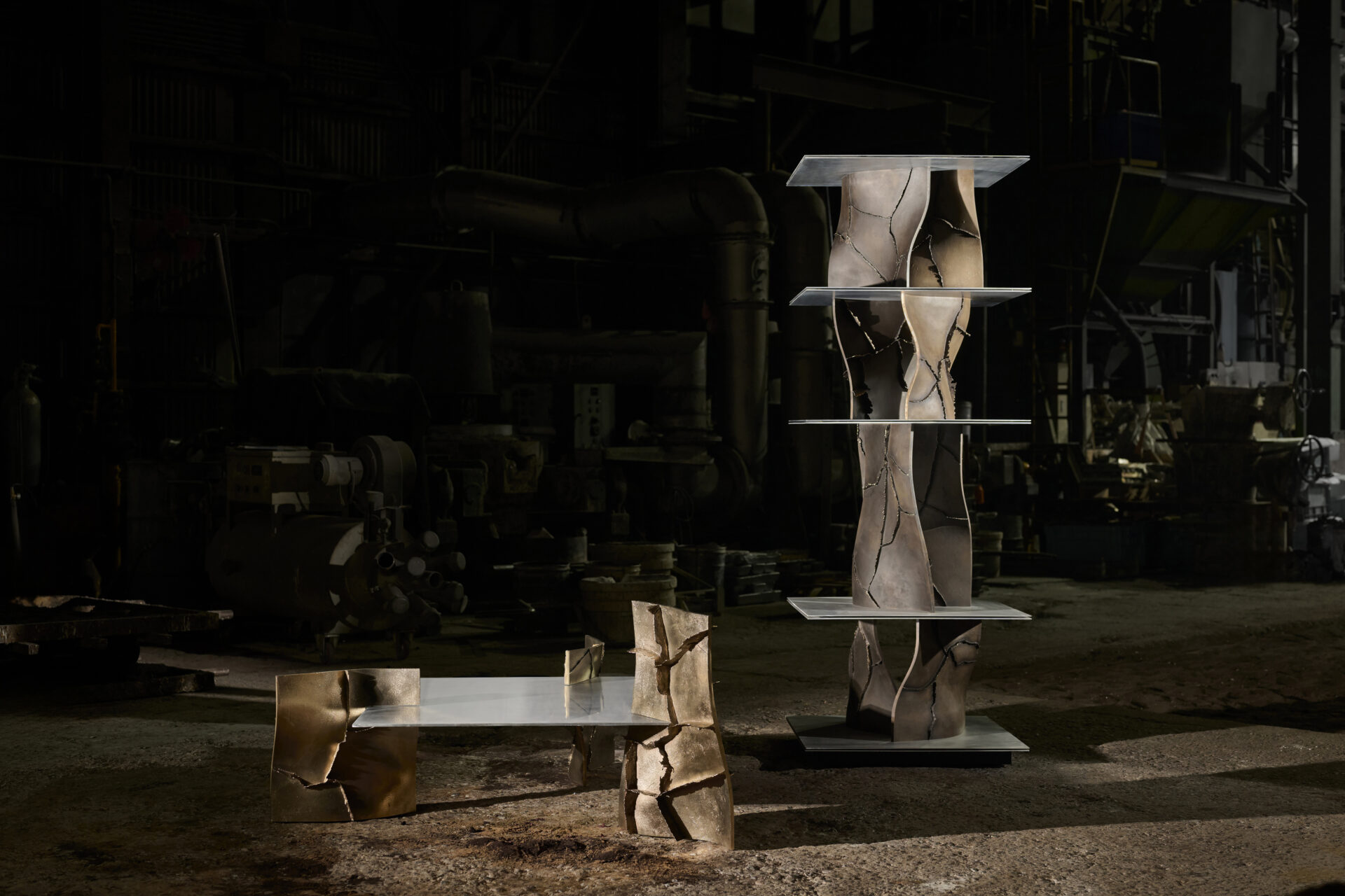 高度な鋳造技術の本質を可視化し、鋳物の鋳造プロセスや道具、素材のふるまいなど、これまで⾒過ごされてきた鋳造⽂化の価値を再定義する「Unseen Objects」の家具コレクションです。we+が平和合金の鋳物工場にて、鋳造プロセスや道具、素材のふるまいを丹念にリサーチ。その中で、金属が凝固する過程で生じ、通常は除去される「バリ」と呼ばれる造形に着目しました。大型鋳物の鋳造に用いられる砂型(砂を材料とする鋳型)は、原型の形やサイズに応じて複数のパーツに分割してつくられますが、溶けた金属が流し込まれ、固まる過程で、それらの継ぎ目から溢れ出る余剰物がバリです。通常は、仕上げ工程で除去されますが、本プロジェクトでは鋳造プロセスから自然と立ち現れる物質の痕跡として捉え直しました。生成されたバリのパネルを積層し、板材を挟むことで、シェルフやローテーブルを構成。制御された工程の中に宿る物質の生命力を、家具に転写することを試みています。