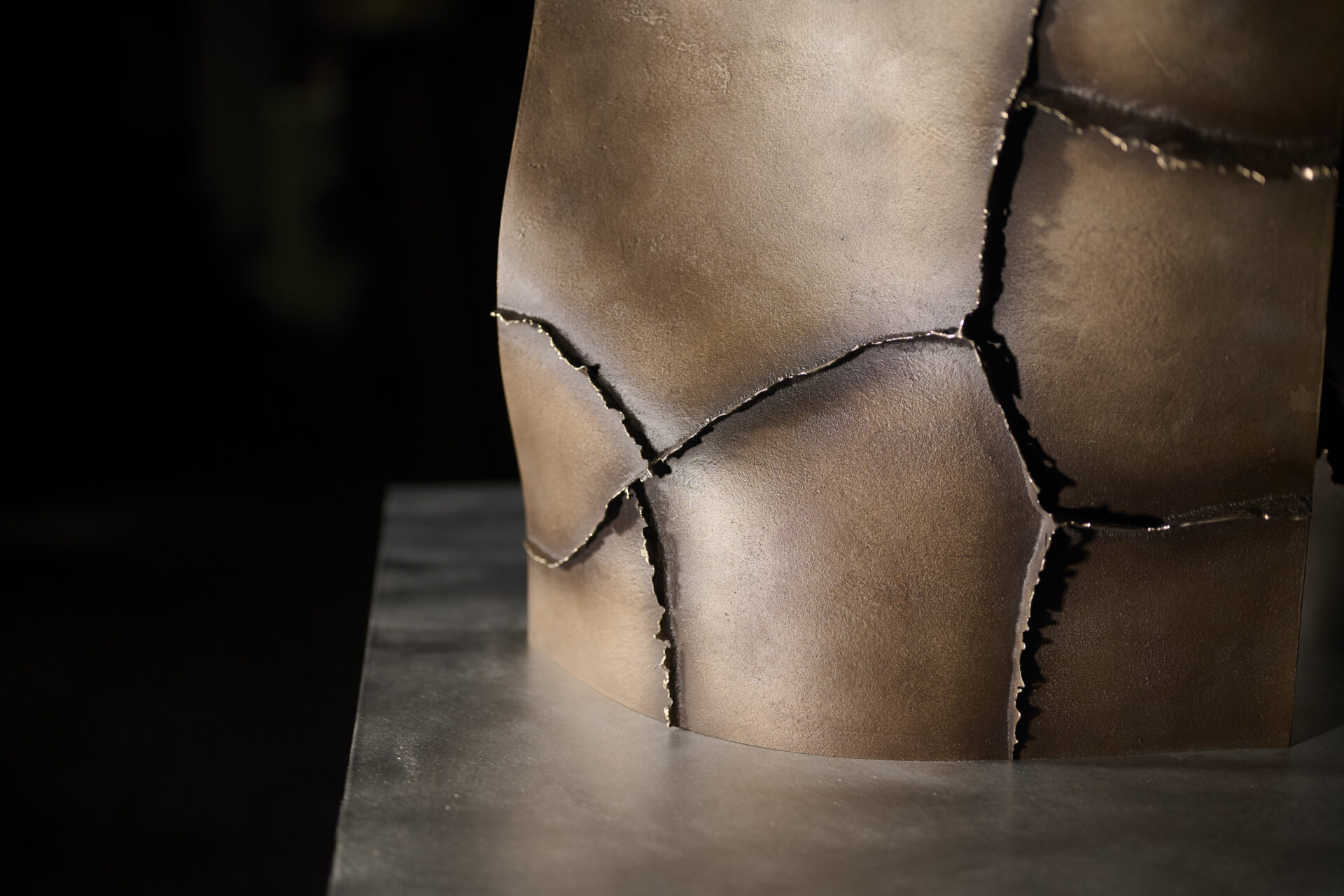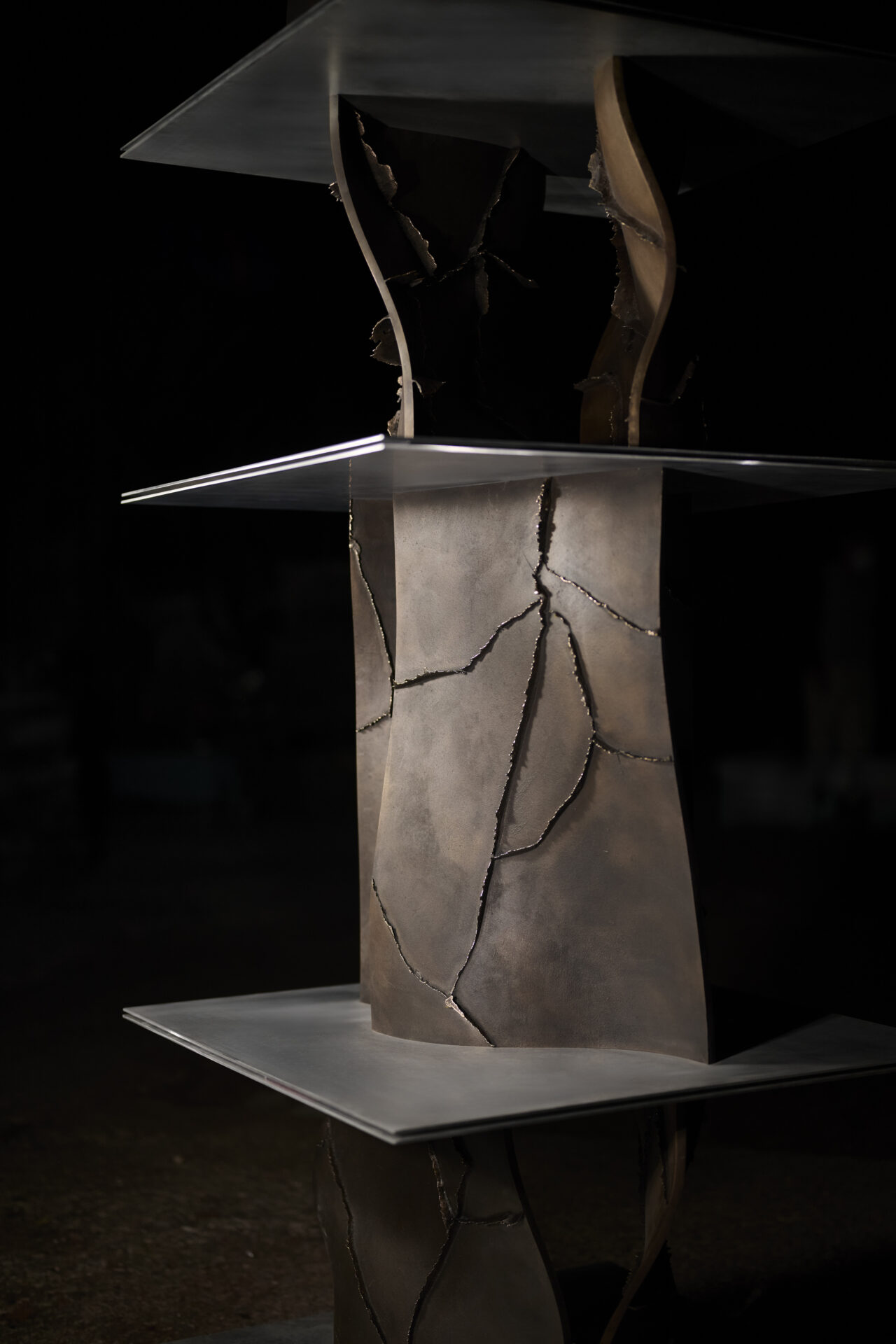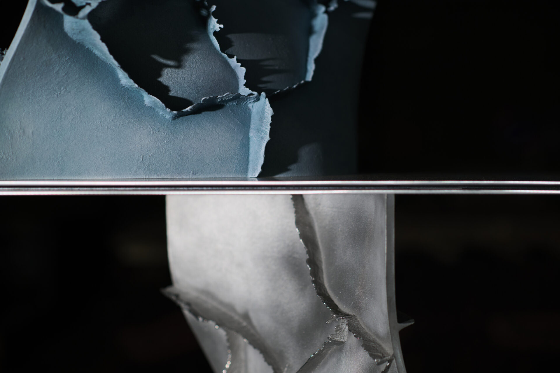 高度な鋳造技術の本質を可視化し、鋳物の鋳造プロセスや道具、素材のふるまいなど、これまで⾒過ごされてきた鋳造⽂化の価値を再定義する「Unseen Objects」の家具コレクションです。we+が平和合金の鋳物工場にて、鋳造プロセスや道具、素材のふるまいを丹念にリサーチ。その中で、金属が凝固する過程で生じ、通常は除去される「バリ」と呼ばれる造形に着目しました。大型鋳物の鋳造に用いられる砂型(砂を材料とする鋳型)は、原型の形やサイズに応じて複数のパーツに分割してつくられますが、溶けた金属が流し込まれ、固まる過程で、それらの継ぎ目から溢れ出る余剰物がバリです。通常は、仕上げ工程で除去されますが、本プロジェクトでは鋳造プロセスから自然と立ち現れる物質の痕跡として捉え直しました。生成されたバリのパネルを積層し、板材を挟むことで、シェルフやローテーブルを構成。制御された工程の中に宿る物質の生命力を、家具に転写することを試みています。
